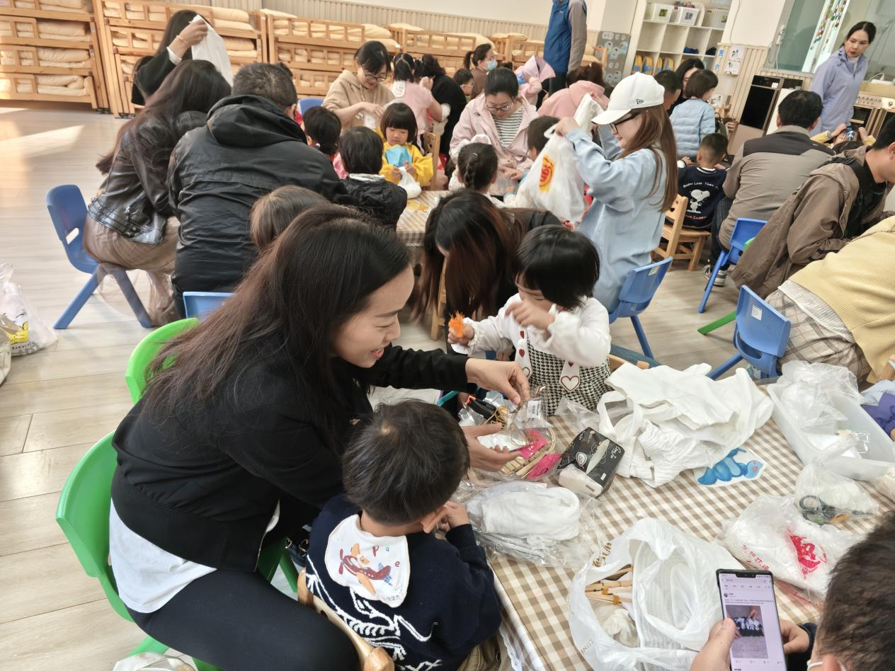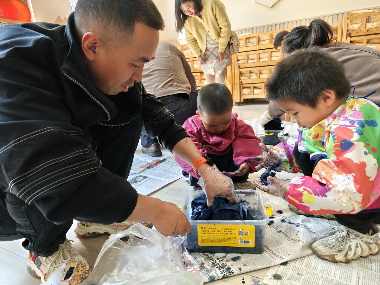 亲子创作环节将活动推向高潮。在家长的鼓励与引导下,孩子们积极参与,小手拿起布料,运用刚刚学到的扎染知识,与家长紧密配合,共同完成折叠、捆扎与染色的过程。各个家庭创意十足,有的选择经典的圆形扎法,有的尝试创新的条纹图案设计。在染料的晕染下,原本洁白的布料逐渐转变为一幅幅绚丽多彩的艺术作品。整个过程中,孩子们的欢声笑语与家长们耐心细致地指导相互交织,温馨的亲子互动场景随处可见。