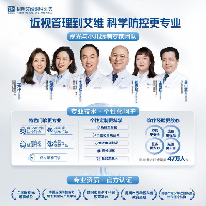 昆明艾维眼科视光及小儿眼科成立于2001年,截止2024年9月已经接诊47万+人次近视患者,现由小儿眼病及青少年近视防控专家李旭松院长、邵彦明副院长、杨亚菲副院长领衔的拥有具备眼科学、视光学、功能影像学等多个学科理论和临床经验的中高级专业医生、视光师团队。对常见的儿童眼病以及儿童疑难复杂的斜视、弱视、近视防控、上睑下垂、眼球震颤、泪道疾病等项目有丰富的临床经验,拥有完整的斜视专科检查诊疗设备。主要在医学验光、眼镜定配(尤其是OK镜和RGP)、视功能检查、弱视训练、低视力康复、眼健康宣教、视光技术培训等领域积累了大量经验。我院2022年成立的眼健康科普馆已成为昆明市科学技术协会和五华区科学技术协会授牌的科普教育基地,为推动健康中国建设,通过普及眼科知识,提高公众对眼部健康的重视程度,为实现全民健康目标贡献力量。