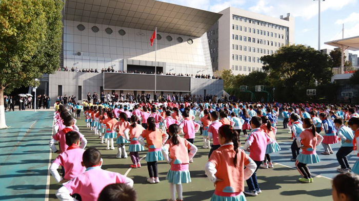 随后,学生展示了毕业季节目《龙狮舞韵》。传统体育、非遗文化与现代艺术结合,彰显“以文化人、以体强身”的育人理念。移步操场,学生正在参与特色大课间——民族韵律操舞和踩高跷,将民族文化传承与体育锻炼有机融合,打造出独具特色的育人新场景。