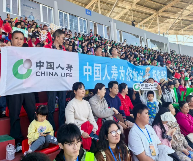赛场内凸显公司为滇超联赛助威的场景:观众台上飘扬舞动的司旗、“中国人寿为你加油 祝你进球!”的横幅,伴随着一阵阵强劲有力的加油呐喊声……