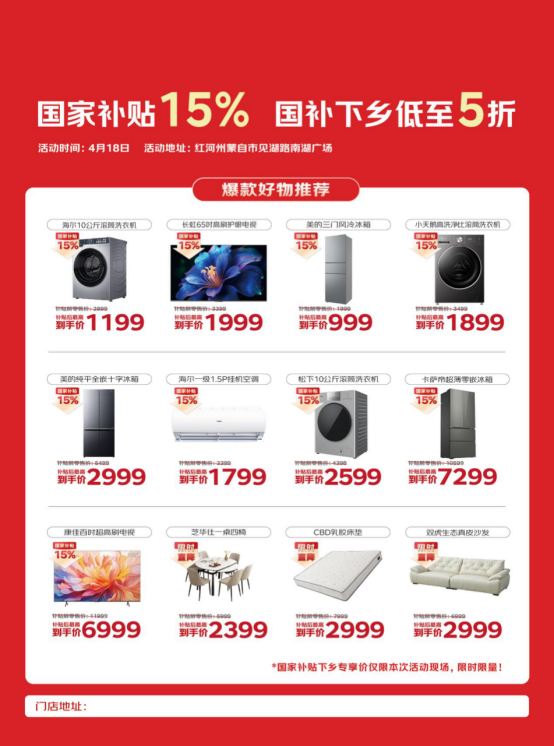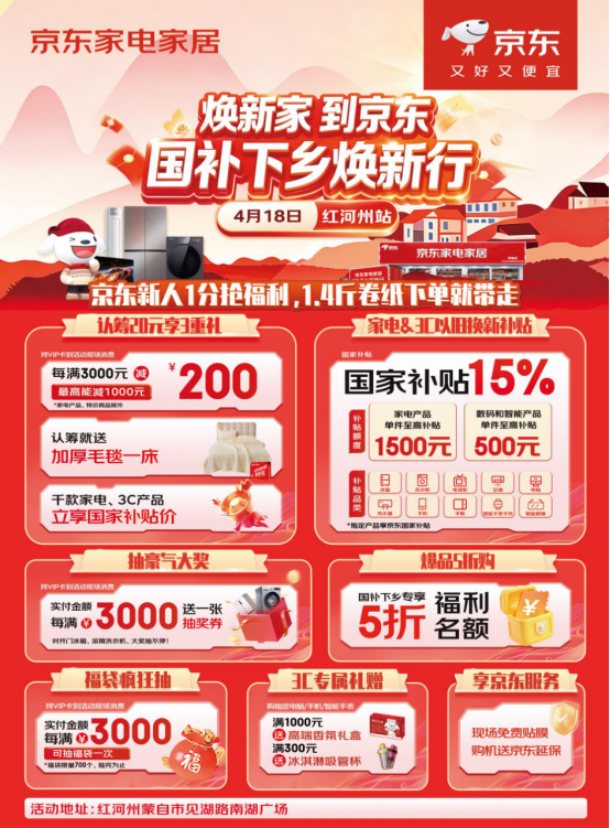 当地消费者记得4月18日到红河州蒙自市见湖路南湖广场,在京东活动现场体验产品,并享国补入手家电、3C数码好物。京东国补大篷车也将为云南曲靖、昭通、红河三地消费者全面普及国补政策,消费者可前往当地京东线下门店享国补换新家电、3C数码好物。