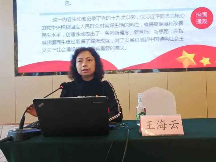 王海云教授以《习近平谈治国理政》第三卷专题学习为切入点,采用视频、高端论述、PPT、评论、图解等宣讲方式,围绕“充分认识习近平新时代中国特色社会主义思想内涵”“准确把握民生建设重要内容和意义”“自觉践行党员初心和使命”三个方面,系统阐述了《习近平谈治国理政》第三卷核心内容和重大意义。同时,王海云教授还结合自身所获,通过举例子、引典故、作分析,将讲理论与讲实际相结合,为使基层群众更加自觉地做习近平新时代中国特色社会主义思想的坚定信仰者、忠实实践者,切实把学习成效转化为政治素质的提升提供有力的思想支撑。