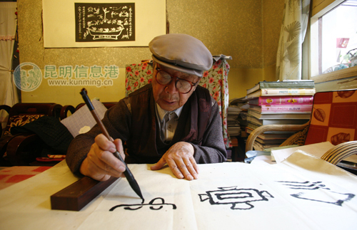“在昆明生活了56年,我已经完全融入了这个城市,一口昆明方言也讲的非常地道了。”老人开心地笑着:“最近,都市时报改版后的昆明读本非常耐读,反映的都是社区居民身边的事。为此,我一直想用东巴文写幅字送给报社,表达一下我对昆明读本的喜爱。”之后,老人仔细用东巴文字书写了“昆明读本”几个字,送给改版后的都市时报。
