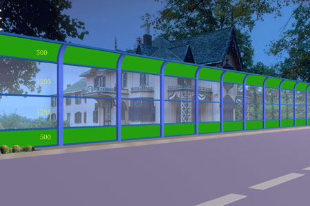 隔音屏为绿色透明隔音板设计,总高4.3米,基座为80厘米高的混凝土防撞栏。隔音屏的下段为50厘米高的吸音屏,内面为带微孔的铝板,外侧为镀锌钢板,中间为吸音棉;隔音屏的上段是50厘米高的弧形反射屏;中段是2.5米高的隔音板。