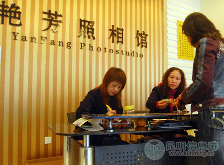 整个店面中,见不到任何老摄影器材,工作人员们使用的工具,都是数码相机和电脑。影楼没有悬挂老昆明人曾经见过的木制牌匾,取而代之的是镶嵌在玻璃上的金色大字,以及悬挂在店内的众多获奖金字牌匾。唯一能证明和说明“艳芳”历史的,在整个照相馆里,只有两个人,他们分别是52岁的高级摄影师赵福阳和34岁的经理施晓波,他们在店里分别工作了34年和16年。