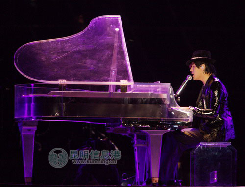 周董用水晶钢琴深情弹唱《黑色幽默》。记者 李振宇/摄