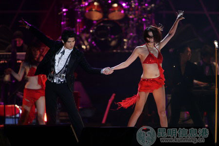 周杰伦与女Dance大跳热舞。记者 李振宇/摄