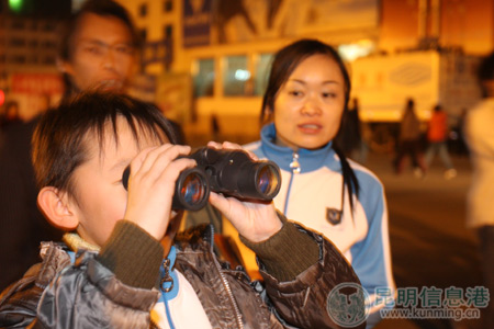小歌迷使用望远镜观看演唱会。 记者 朱帅/摄