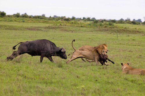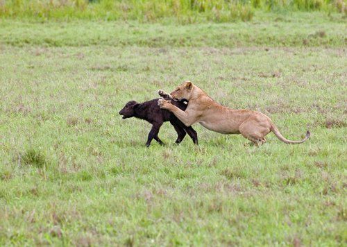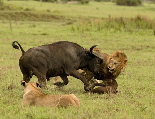 2009年1月18日,在南非博茨瓦纳,摄影师Lee Whittam拍到狮子和非洲野牛大战的精彩场面。当时,一头狮子扑到了一头非洲小野牛,正当它准备开始享用美餐时,大野牛突然冲向狮子去解救它的孩子,在经过大约15分钟的搏斗后,小野牛最终还是不幸死亡,大野牛虽然没有成功解救孩子,但是却展示了伟大的爱。