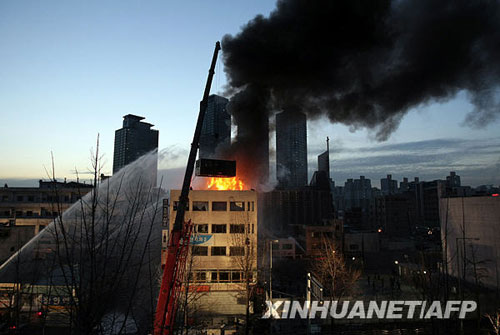 1月20日,在韩国首都首尔,警方人员试图接近着火的大楼顶部。新华社/法新