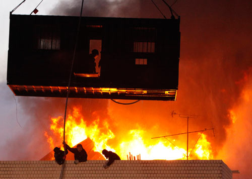 1月20日,在韩国首都首尔,一台起重机将一个载有突击队员的箱子移向着火的大楼顶部。自19日开始,数十名抗议一项政府拆迁赔偿计划的居民占据了首尔市中心一座建筑的顶部,并与警方发生对抗。20日凌晨,抗议者使用燃烧瓶导致大楼起火,造成5人死亡。新华社/法新