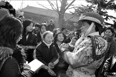 在祭地仪式结束后“回宫”的路上,“夹道欢送”的游客发现今年的皇帝有些“蹊跷”,“咦,新皇帝登基啦?还挺像。”也有些地坛庙会的常客一眼认出了混在官员队伍里护驾的“老皇帝”。扮了19年皇帝的齐学恩对他的“接班人”很满意,“扮皇帝要的就是那个‘范儿’,今天他做到了。做了这么多年,我知道,挺辛苦的。”