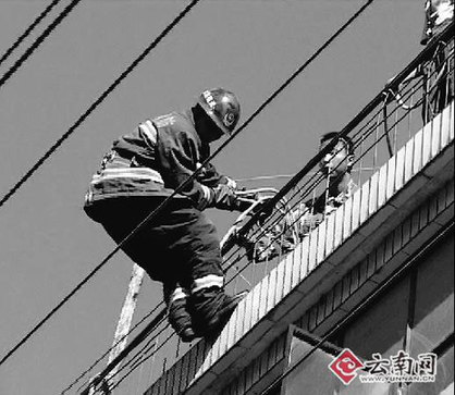 5分钟后,消防官兵到达现场,只见一幢五层居民楼的三楼窗台边上坐着一名女子,摇晃着双脚还不时地高声呼喊着。消防人员随后发现,房门已被该女子反锁。距3楼窗口不到两米处还有一排电线,是供弥城西区居民日常用电的主线路。