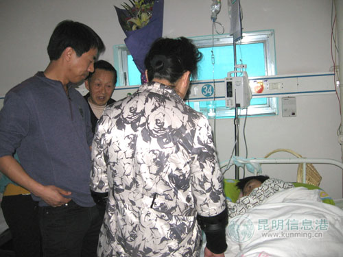 今天下午2点半,昆明第八中学的校长、校团委副书记等校领导捧着一束鲜花来到四十三医院看望孙浩云。孙浩云此时正躺在病榻上输液,因连续多日腹泻,身体已经非常虚弱,连说话都非常吃力。看到老师们前来探望,他脸上露出了久违的笑容。校长向孙浩云的妈妈问了孙浩云的病情,然后关切孙浩云:“安心治疗,不要担心经费问题”。