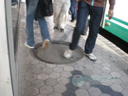 昆明信息港讯 近日,网友“落落繁星”在彩龙论坛发帖称:小花园公交站台上有个窨井堪称“陷阱”,忙于赶车的乘客频频在这里“中招”,很多人都在这里被绊倒或者扭伤了脚,希望有关部门来“管一管”。记者就此采访了相关管理部门,得到的答复均为“谁建设归谁管”,至于该站台到底是哪个产权单位建设的,包括昆明市城管局、公用事业局及公交总局在内的管理部门却纷纷表示“不清楚”。