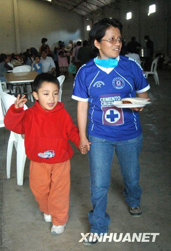 5月2日,墨西哥东部韦拉克鲁斯州男孩埃尔南德斯和母亲一起走出政府临时搭建的免费食堂。新华社发(卡拉加西亚摄)