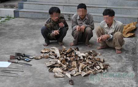 3名外籍盗伐人员和他们被缴的斧头3把、砍刀3把、锉子3把及部分“土沉香”半成品