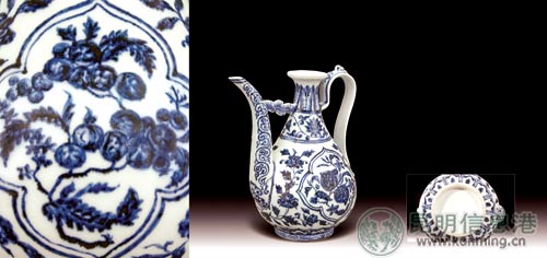 据云南典藏有关负责人介绍,拍卖“标王”青花开光折枝花果纹执壶通体施以白釉,釉质青白透澈,肥润晶莹,青花发色翠蓝深沉,局部有铁锈斑,图案为上等“苏麻离青”钴料所绘。从文物艺术品的收藏价值来看,执壶整器端庄大气,做工精湛,属于明代永乐时期青花瓷中的代表之作。目前,除国内外的文物馆藏之外,同类器物能在国内外市场上流通的可谓屈指可数,很少见诸于市,因此也就更加弥足珍贵了。