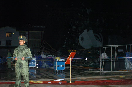 前晚,丽江市华坪县2009首届芒果文化节开幕式暨大型文艺演出遭暴雨袭击被迫中止。演出舞台灯光钢架倒塌,造成4人受伤,多台演出转播设备受损。事故发生后,华坪县委、县政府立即启动应急预案,公安干警和武警官兵迅速出动,现场8000余名来宾和观众被安全疏散。