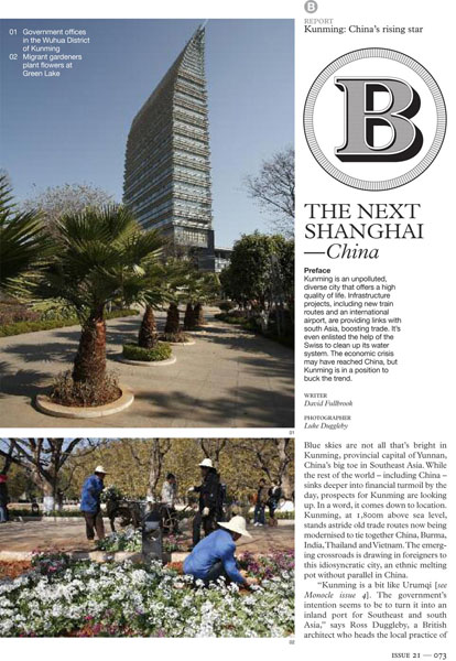 文章内容概要:“昆明是一个未受污染的,且能提供高质量生活的多元化城市。包含新火车线路和一个国际机场在内的基础设施,加强同南亚联系的同时也促进了贸易。它甚至邀请了瑞士帮助治理城市的水环境。金融危机可能已经达到中国,但昆明却能抵制这场危机。”文章还采访了数位旅居在昆明的外国人,并配发了多张关于昆明的照片。