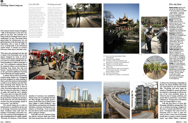 “昆明有一点像乌鲁木齐,政府有意让它成为一个面向东南亚和南亚的内陆港口,”一位负责当地项目的英国Smith Caradoc-Hodgkins建筑事务所的建筑师Ross Duggleby说。“我在这里谈论发展是较为具体的。它要成为东南亚枢纽的目标很容易理解。”他说。这是中国,基础设施的宏伟计划不会让绘图板上落上灰尘。一条将于2012年通车的高速公路正在建设中,通往越南首都河内。它将3天的行程缩短为不到1天。
