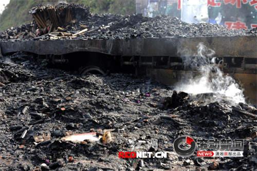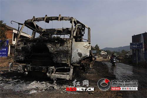 由于司机和车上乘客及时逃生,并没有造成人员伤亡,不过价值10万元的烟花被烧毁,大卡车也被烧得面目全非。(潇湘晨报 记者 陈斌)