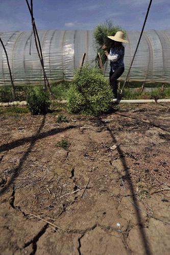 4月6日,在云南昆明呈贡县斗南花卉种植基地,由于干旱,花棚旁边的土地开裂。