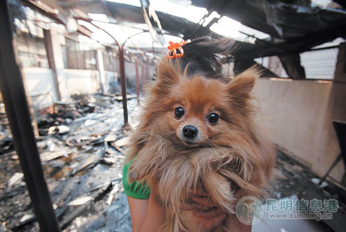 一名孩子带着宠物狗在烧毁的车棚前 首席记者杨赋/摄