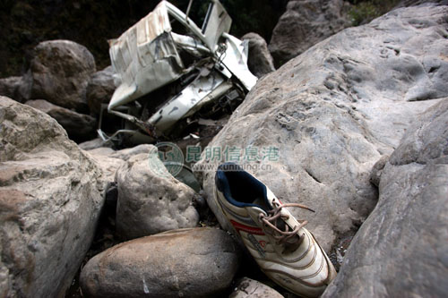 坠入河底的银灰色蓝箭低速载货汽车已四分五裂,3个车轮飞到车身20米外。车身上的喷字显示,这辆双排座位的小卡车准乘6人,载质量900千克。河床石头上,10来头村民购买的小猪崽被摔死。仰望百米悬崖,货车跌落处全是巨石,无树木阻挡。事故现场的猪、鸡、鱼及食品表明,遭遇车祸的村民都是赶集回来,事发地离他们的村子只有七八公里。