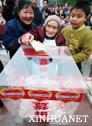 4月25日,“记忆5·12 情系玉树县”四川泸州市抗震救灾募捐活动在泸州市报恩塔文化广场举行,家住城区濂溪路的103岁老人韦从蓉为玉树灾区重建捐款200元。新华社发(曹卫兵 摄)