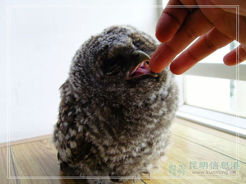 昆明信息港讯 记者赵鹏 就在五一昆明市民忙着观赏花车、品尝美食的时候,彩龙网友“纳米”的家里却迎来了一位“小朋友”,一只幼小的猫头鹰。从路上捡到猫头鹰后,“纳米”一家人精心照顾,并经过多方打听将其送往云南省野生动物收容拯救中心,为“小家伙”找到新家。