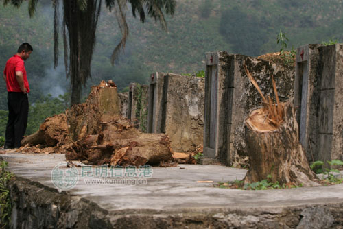 “陵园的树都被砍倒了,有的还压在了烈士墓上,刻在纪念碑上的烈士名字也被敲掉,听说这里是要修公路!”5月3日,一位烈士的家属在祭拜完河口南溪烈士陵园后,致电都市时报反映。