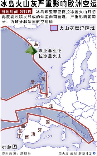 冰岛埃亚菲亚德拉冰盖火山灰9日影响法国、意大利、葡萄牙、西班牙空中航线。