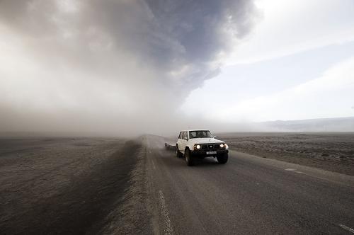 5月8日,一辆汽车驶过冰岛埃亚菲亚德拉冰盖火山喷发出的火山灰。冰岛埃亚菲亚德拉冰盖火山7日再次剧烈喷发,腾起灰黑色蘑菇云,欧洲航空业再度受到火山灰威胁。新华社/法新