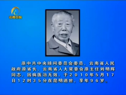原中共中央顾问委员会委员,云南省人民政府原省长,云南省人大常委会原主任刘明辉同志,因病医治无效,于2010年5月17日12时35分在昆明逝世,享年96岁。