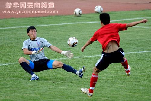 6月19日,江苏队守门员(左)封堵国家队球员郜林攻门。当日,国足与中超江苏舜天队在昆明市新亚洲体育中心进行了一场教学热身赛,国家队以4比1战胜江苏队。新华社记者秦晴摄