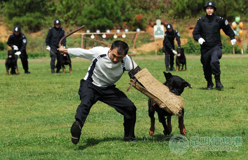 特警支队现场演练,警犬死死咬住“歹徒”。记者杜文蕾摄