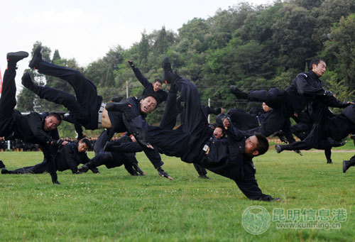 近身格斗、围剿窝点、实弹射击……在一个半小时的演练中,400余名特警的绝技赢得了不绝的掌声。8月3日,昆明市公安局特警支队举行实战演练。