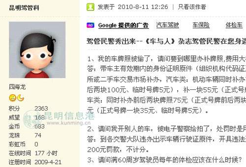 “我的车牌照被偷了,请问要到哪里办补牌照,费用大概是多少?”“请问满60周岁驾驶员每年的体检应该在什么时候?”“请问购买排量超过2.5L的汽车除了缴纳购置税,是否还要交其他税?”随着昆明市网络政民互动的深入推进,昆明信息港彩龙论坛正日益变成网友与相关部门互动的重要平台。就连一向是政民互动的“常客”的“昆明驾管科,也一改往日网友投诉,然后上线跟帖的习惯,开始主动实名发帖。
