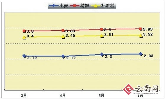 面条企业的压力并非空穴来风,数据显示今年上半年我省面粉类平均价格3.29元,比去年同期涨12%。标准粉上半年平均价格3.41元/公斤,同比上涨10.85%;玉米面上半年平均价格2.69元/公斤,同比上涨14.31%;精粉上半年平均价格3.78元/公斤,同比上涨10.8%。