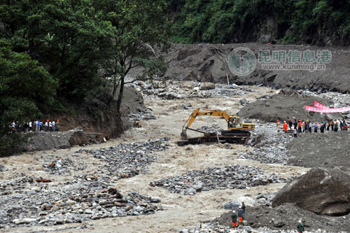 从前天夜里到昨天中午,贡山一直下雨,怒江边的几台大型机械仍在紧张工作,只是淤泥太深,一不小心就陷了进去,搜寻失踪人员的进度非常缓慢。昨天下午1点左右,汹涌的东月谷河水将原本抢通的便桥冲毁,导致连接泥石流灾害现场和贡山县城的公路交通再次中断。