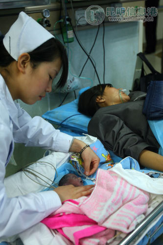 下午3点55分,孩子微弱的哭声传播在抢救室里时,从产科派来会诊的医生也来了,大家没看一分钟,产科医生马上就对孩子进行吸痰、擦粉等护理,父母没有准备襁褓,医生们就用急诊科里的被子、毯子、医用白布将孩子包裹起来。护士甚至口对口地对孩子进行人工呼吸,孩子有了自主呼吸,脸色红润。