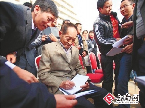 在偶像袁隆平面前,上百名学生一手拿相机或手机,一手拿笔记本欲求签名,将现场围得水泄不通。昨天,80岁高龄的世界“杂交水稻之父”、中国工程院院士袁隆平一走进云南农业大学,立即成为师生追捧的对象,现场不亚于任何大牌演艺明星出场。