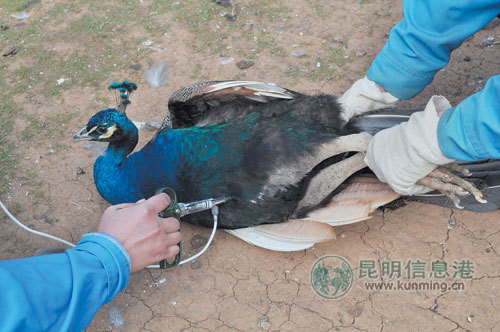 工作人员在给孔雀注射疫苗