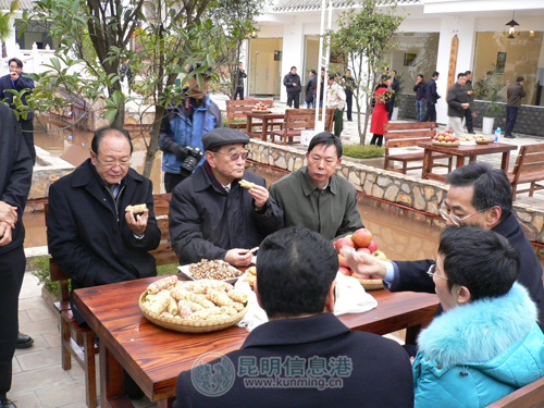 虽然当天昭通下起了雨夹雪,但小寨乡村民的热情丝毫不减。村民们自发以当地特有的歌舞迎接厉教授一行的到来。厉教授喝下了当地少数民族同胞送上的热茶,品尝起农家玉米。当问起近年来的生活状况时,当地村民说,自从实施“整乡推进”项目以来,生活水平显著提高了,通过经营农家乐,年收入能达到4至5万元。