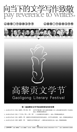 已走过两个年头的“高黎贡文学节”,以繁荣云南文学、鼓励云南文学创作、推出本土优秀作家、挖掘云南文学新人为宗旨,以促进云南与国内外文学界的相互交流为目标,在短短两年内,该奖已成为云南本土最受关注的文学盛事。此次文学节为期三天,除了在众多投稿的作家中评选出高黎贡文学奖外,还邀请了省内外著名作家、学者、网络写手与读者进行近距离接触,届时作家杨黎、云南本土作家朱霄华将通过朗诵、谈话等形式与读者进行直接交流。
