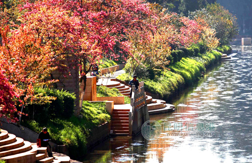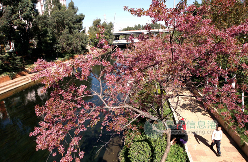 12月19日,位于江岸小区的盘龙江畔,数十棵冬樱花盛开,盛开的冬樱花投影在清澈的江面上,一派秀丽田园般的景致,市民悠闲地在阳光下享受着春天般的生活。当全国遭遇寒流等极端天气的时候,美丽的春城却天天阳光明媚,鲜花盛开。(昆明日报 首席记者赵伟摄影报道)