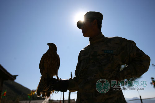 在丽江乐园狩猎场,还有一个鹰猎表演的项目。工作人员把一只野鸡放开,猎狗把野鸡撵飞起来,随着驯鹰人的一声口令,老鹰展翅飞入长空,瞬间捕获“逃命”的野鸡。一次捕猎成功之后,驯鹰的人会“奖励”老鹰吃野鸡的大脑,但并不让野鸡吃饱,“吃饱后它就不愿意捕猎了”。