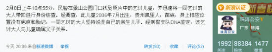上午11时53分,珠海公安的官方微博发布的消息却让大家失望:“昨天微博照片上的乞讨男孩已经找到,经初步了解,孩子大约5到6岁,贵州凯里人,说苗语,听不懂普通话,身上相应位置没有伤疤和胎记,与陕西被拐儿童常懂懂的情况不符,一同乞讨的大人坚持说是自己的亲生儿子,详细情况还在进一步调查中。”