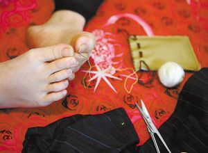 记者见到罗凤枝时,她正在缝补衣服,两根脚趾夹着细细的钢针在衣服上灵活地穿来穿去,一会儿就补好了。